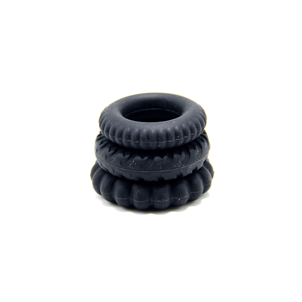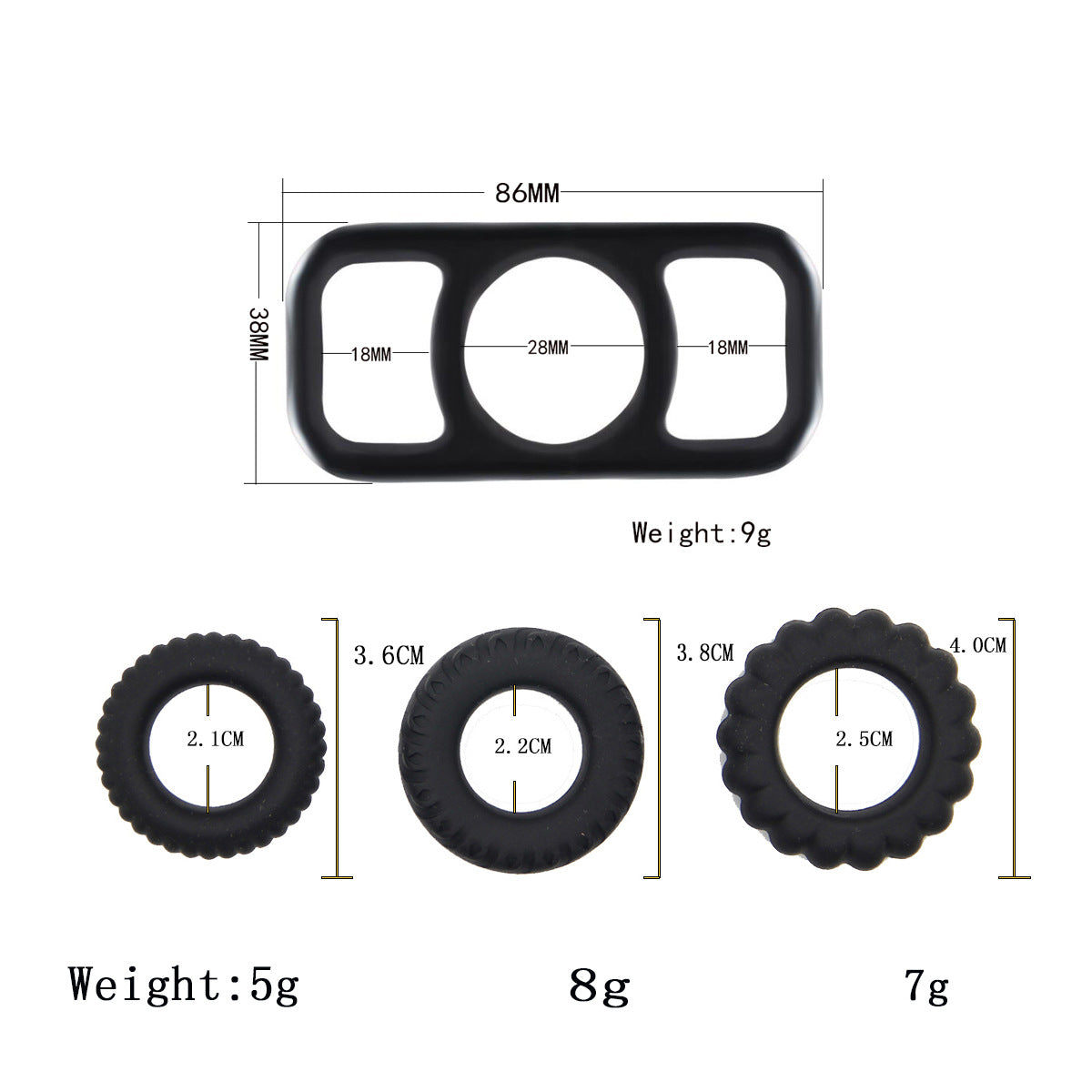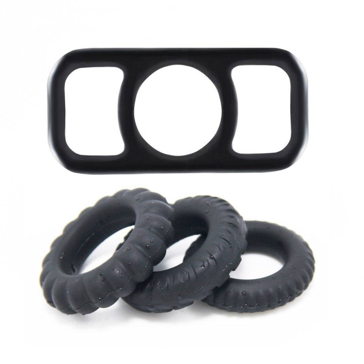 This 4-piece silicone cock ring set features a unique wheel-like texture design for enhanced stimulation and grip. Includes three textured rings in different sizes and one dual-opening stretchable band—perfect for controlling ejaculation, increasing sensitivity, and boosting erection firmness. Made from body-safe, non-porous silicone, it’s easy to clean and reusable.
